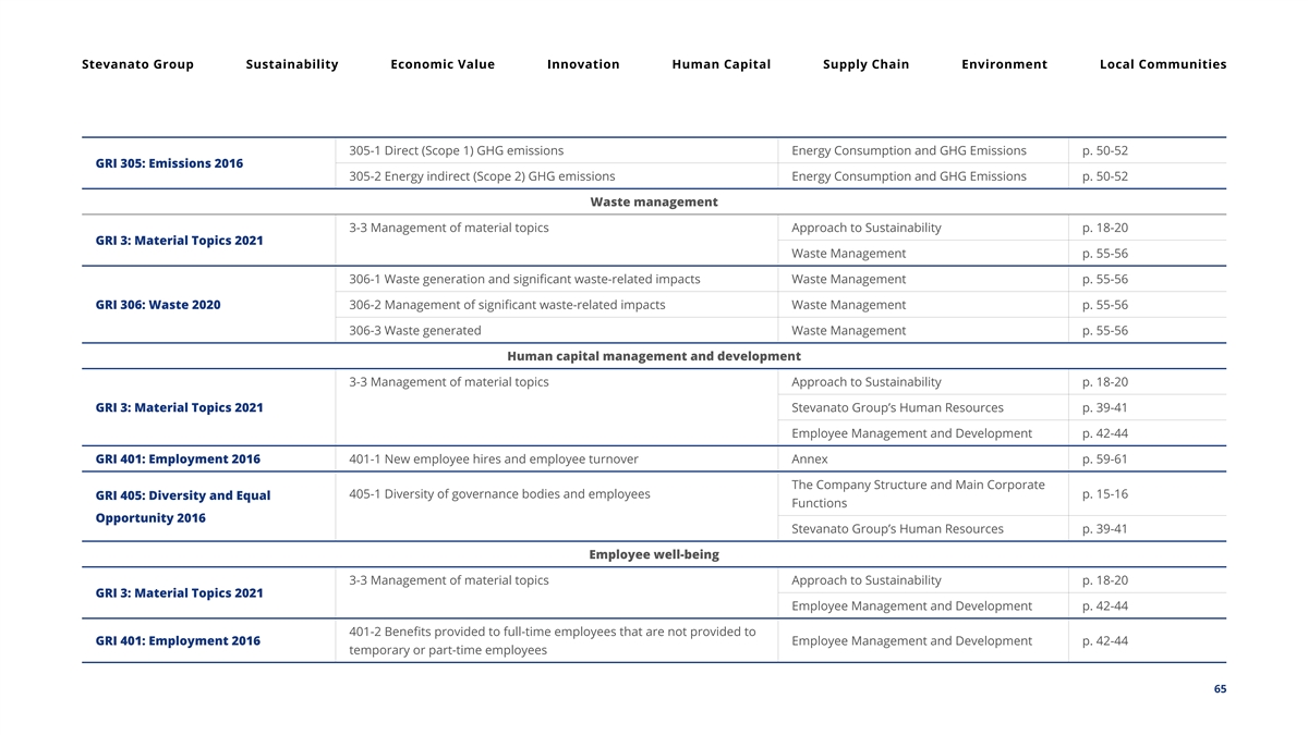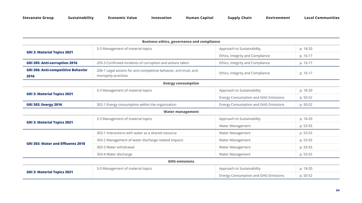 Stevanato Group Sustainability Economic Value Innovation Human Capital Supply Chain Environment Local Communities Business ethics, governance and compliance 3-3 Management of material topics Approach to Sustainability p. 18-20 GRI 3: Material Topics 2021 Ethics, Integrity and Compliance p. 16-17 GRI 205: Anti-corruption 2016 205-3 Confirmed incidents of corruption and actions taken Ethics, Integrity and Compliance p. 16-17 GRI 206: Anti-competitive Behavior 206-1 Legal actions for anti-competitive behavior, anti-trust, and Ethics, Integrity and Compliance p. 16-17 monopoly practices 2016 Energy consumption 3-3 Management of material topics Approach to Sustainability p. 18-20 GRI 3: Material Topics 2021 Energy Consumption and GHG Emissions p. 50-52 GRI 302: Energy 2016 302-1 Energy consumption within the organization Energy Consumption and GHG Emissions p. 50-52 Water management 3-3 Management of material topics Approach to Sustainability p. 18-20 GRI 3: Material Topics 2021 Water Management p. 53-55 303-1 Interactions with water as a shared resource Water Management p. 53-55 303-2 Management of water discharge-related impacts Water Management p. 53-55 GRI 303: Water and Effluents 2018 303-3 Water withdrawal Water Management p. 53-55 303-4 Water discharge Water Management p. 53-55 GHG emissions 3-3 Management of material topics Approach to Sustainability p. 18-20 GRI 3: Material Topics 2021 Energy Consumption and GHG Emissions p. 50-52 64