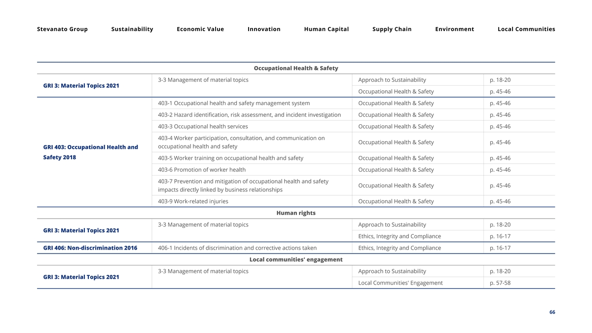Stevanato Group Sustainability Economic Value Innovation Human Capital Supply Chain Environment Local Communities Occupational Health & Safety 3-3 Management of material topics Approach to Sustainability p. 18-20 GRI 3: Material Topics 2021 Occupational Health & Safety p. 45-46 403-1 Occupational health and safety management system Occupational Health & Safety p. 45-46 403-2 Hazard identification, risk assessment, and incident investigation Occupational Health & Safety p. 45-46 403-3 Occupational health services Occupational Health & Safety p. 45-46 403-4 Worker participation, consultation, and communication on Occupational Health & Safety p. 45-46 occupational health and safety GRI 403: Occupational Health and Safety 2018 403-5 Worker training on occupational health and safety Occupational Health & Safety p. 45-46 403-6 Promotion of worker health Occupational Health & Safety p. 45-46 403-7 Prevention and mitigation of occupational health and safety Occupational Health & Safety p. 45-46 impacts directly linked by business relationships 403-9 Work-related injuries Occupational Health & Safety p. 45-46 Human rights 3-3 Management of material topics Approach to Sustainability p. 18-20 GRI 3: Material Topics 2021 Ethics, Integrity and Compliance p. 16-17 GRI 406: Non-discrimination 2016 406-1 Incidents of discrimination and corrective actions taken Ethics, Integrity and Compliance p. 16-17 Local communities' engagement 3-3 Management of material topics Approach to Sustainability p. 18-20 GRI 3: Material Topics 2021 Local Communities' Engagement p. 57-58 66