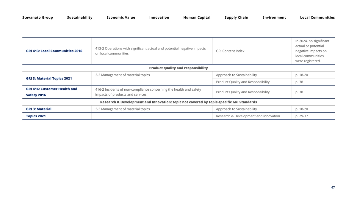 Stevanato Group Sustainability Economic Value Innovation Human Capital Supply Chain Environment Local Communities In 2024, no significant actual or potential 413-2 Operations with significant actual and potential negative impacts GRI 413: Local Communities 2016 GRI Content Index negative impacts on on local communities local communities were registered. Product quality and responsibility 3-3 Management of material topics Approach to Sustainability p. 18-20 GRI 3: Material Topics 2021 Product Quality and Responsibility p. 38 GRI 416: Customer Health and 416-2 Incidents of non-compliance concerning the health and safety Product Quality and Responsibility p. 38 impacts of products and services Safety 2016 Research & Development and Innovation: topic not covered by topic-specific GRI Standards GRI 3: Material 3-3 Management of material topics Approach to Sustainability p. 18-20 Topics 2021 Research & Development and Innovation p. 29-37 67
