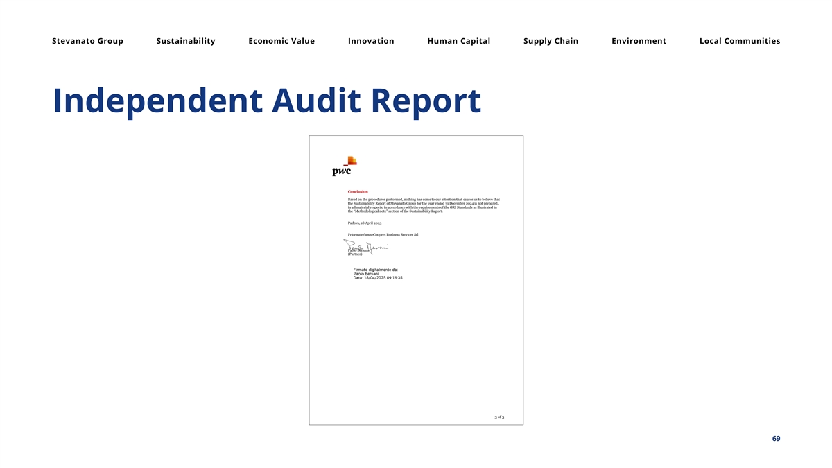 Stevanato Group Sustainability Economic Value Innovation Human Capital Supply Chain Environment Local Communities Independent Audit Report 69