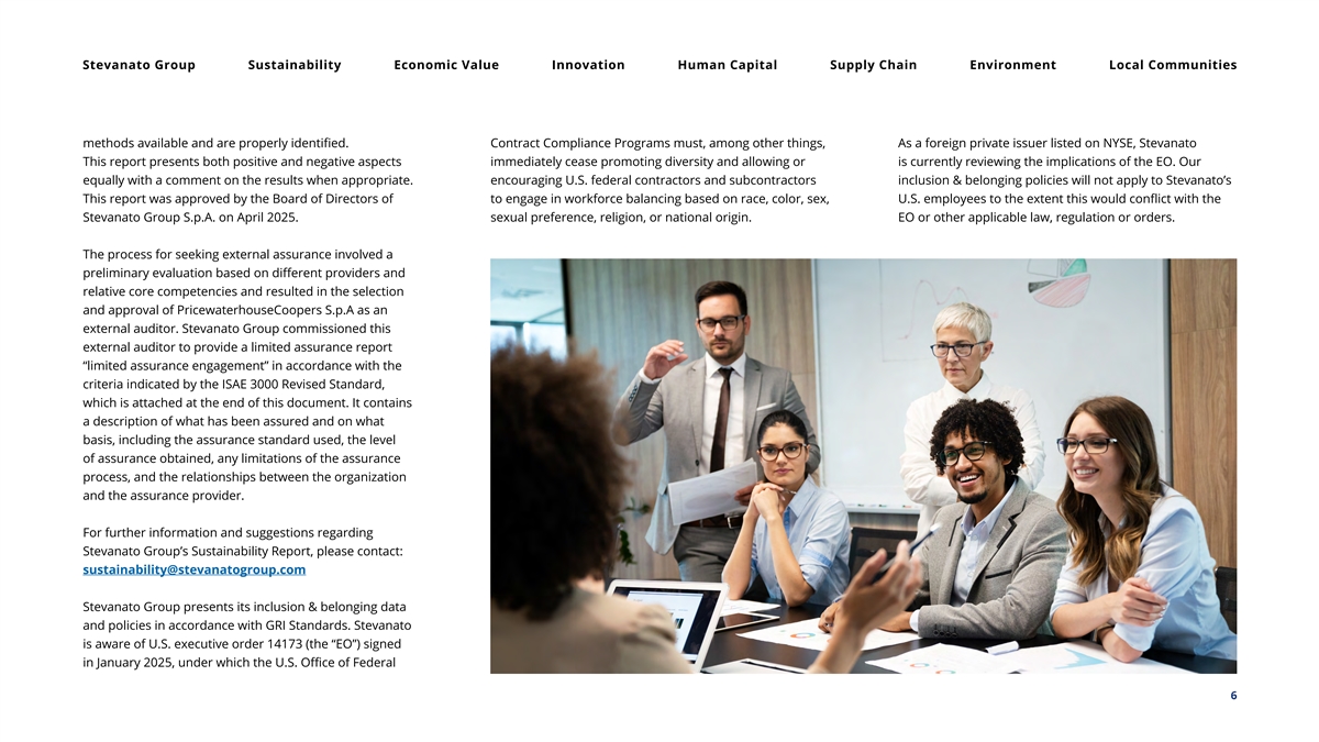 Stevanato Group Sustainability Economic Value Innovation Human Capital Supply Chain Environment Local Communities methods available and are properly identified. Contract Compliance Programs must, among other things, As a foreign private issuer listed on NYSE, Stevanato This report presents both positive and negative aspects immediately cease promoting diversity and allowing or is currently reviewing the implications of the EO. Our equally with a comment on the results when appropriate. encouraging U.S. federal contractors and subcontractors inclusion & belonging policies will not apply to Stevanato’s This report was approved by the Board of Directors of to engage in workforce balancing based on race, color, sex, U.S. employees to the extent this would conflict with the Stevanato Group S.p.A. on April 2025. sexual preference, religion, or national origin. EO or other applicable law, regulation or orders. The process for seeking external assurance involved a preliminary evaluation based on different providers and relative core competencies and resulted in the selection and approval of PricewaterhouseCoopers S.p.A as an external auditor. Stevanato Group commissioned this external auditor to provide a limited assurance report “limited assurance engagement” in accordance with the criteria indicated by the ISAE 3000 Revised Standard, which is attached at the end of this document. It contains a description of what has been assured and on what basis, including the assurance standard used, the level of assurance obtained, any limitations of the assurance process, and the relationships between the organization and the assurance provider. For further information and suggestions regarding Stevanato Group’s Sustainability Report, please contact: sustainability@stevanatogroup.com Stevanato Group presents its inclusion & belonging data and policies in accordance with GRI Standards. Stevanato is aware of U.S. executive order 14173 (the “EO”) signed in January 2025, under which the U.S. Office of Federal 6