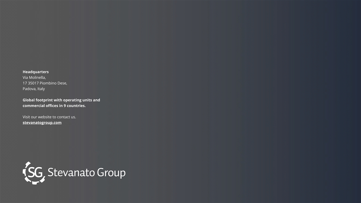 Headquarters Via Molinella, 17 35017 Piombino Dese, Padova, Italy Global footprint with operating units and commercial offices in 9 countries. Visit our website to contact us. stevanatogroup.com 70