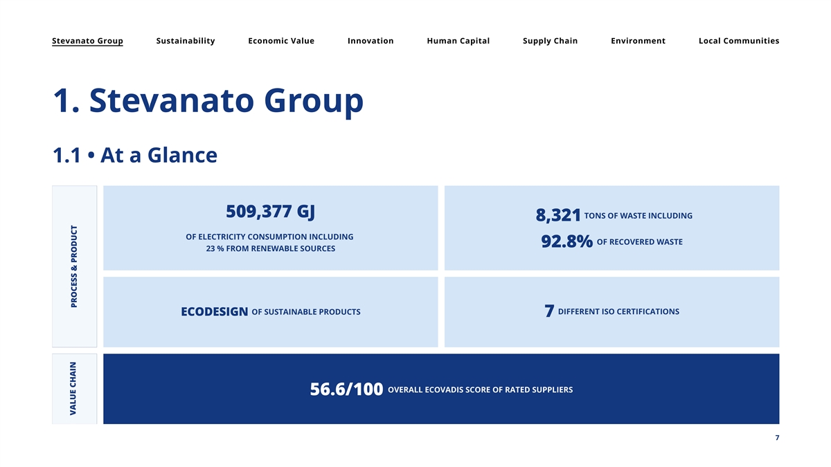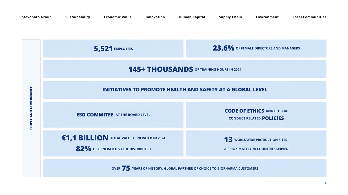 Stevanato Group Sustainability Economic Value Innovation Human Capital Supply Chain Environment Local Communities 1. Ste vanato Group 1.1 • At a Glance 7 7