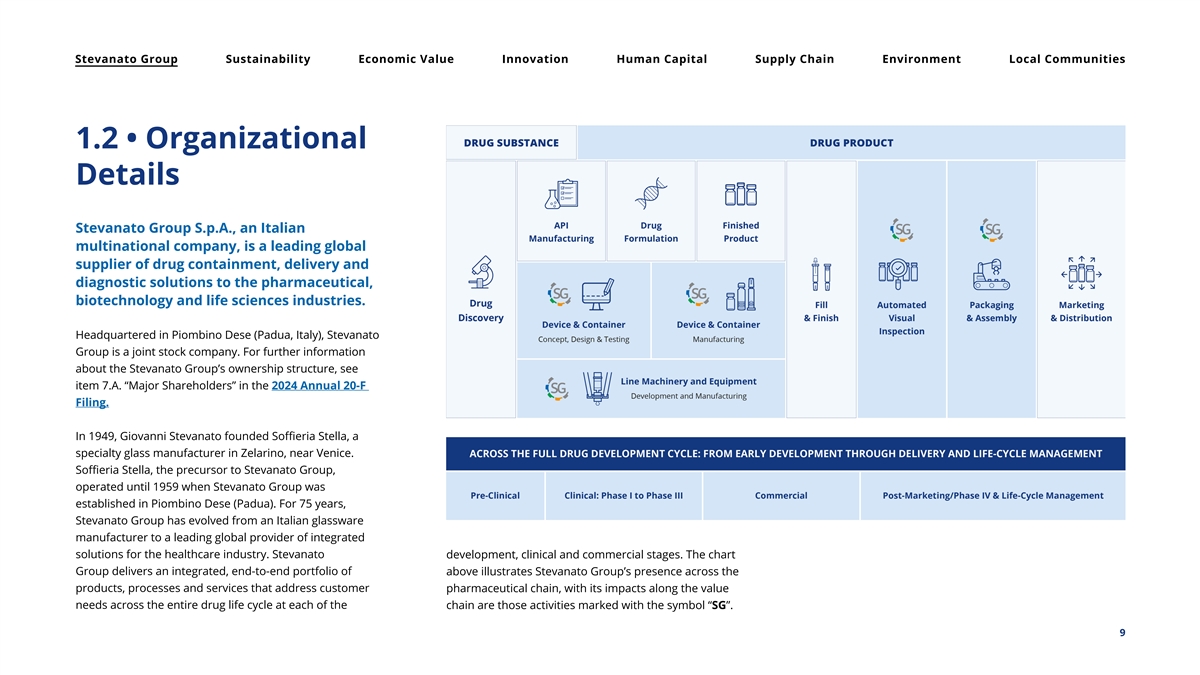 Stevanato Group Sustainability Economic Value Innovation Human Capital Supply Chain Environment Local Communities 1.2 • Organizational Details Stevanato Group S.p.A., an Italian multinational company, is a leading global supplier of drug containment, delivery and diagnostic solutions to the pharmaceutical, biotechnology and life sciences industries. Headquartered in Piombino Dese (Padua, Italy), Stevanato Group is a joint stock company. For further information about the Stevanato Group’s ownership structure, see item 7.A. “Major Shareholders” in the 2024 Annual 20-F Filing. In 1949, Giovanni Stevanato founded Soffieria Stella, a specialty glass manufacturer in Zelarino, near Venice. Soffieria Stella, the precursor to Stevanato Group, operated until 1959 when Stevanato Group was established in Piombino Dese (Padua). For 75 years, Stevanato Group has evolved from an Italian glassware manufacturer to a leading global provider of integrated solutions for the healthcare industry. Stevanato development, clinical and commercial stages. The chart Group delivers an integrated, end-to-end portfolio of above illustrates Stevanato Group’s presence across the products, processes and services that address customer pharmaceutical chain, with its impacts along the value needs across the entire drug life cycle at each of the chain are those activities marked with the symbol “SG”. 9